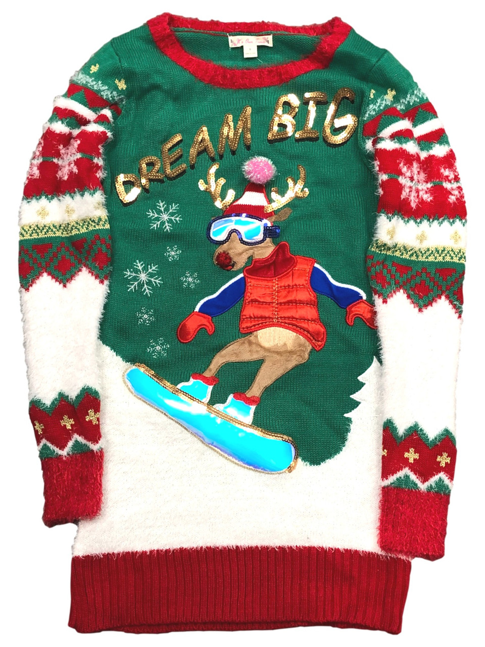 You will love wearing this funny green snowboarding reindeer sequinned "Dream big" Christmas tunic sweater this holiday season!