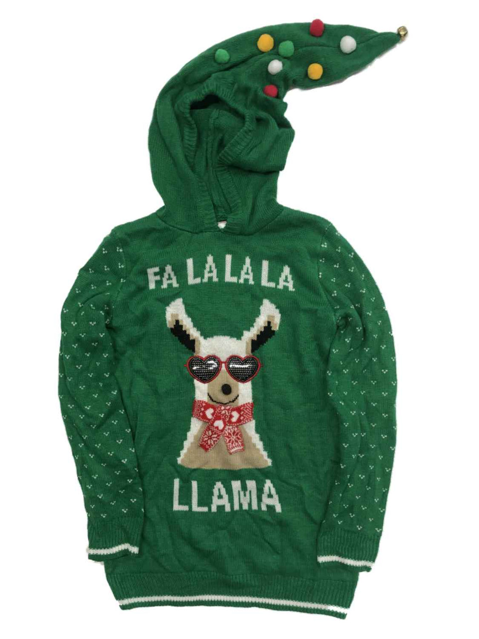 You will get lots of attention in this fun hooded green "Fa la llama" holiday sweater!