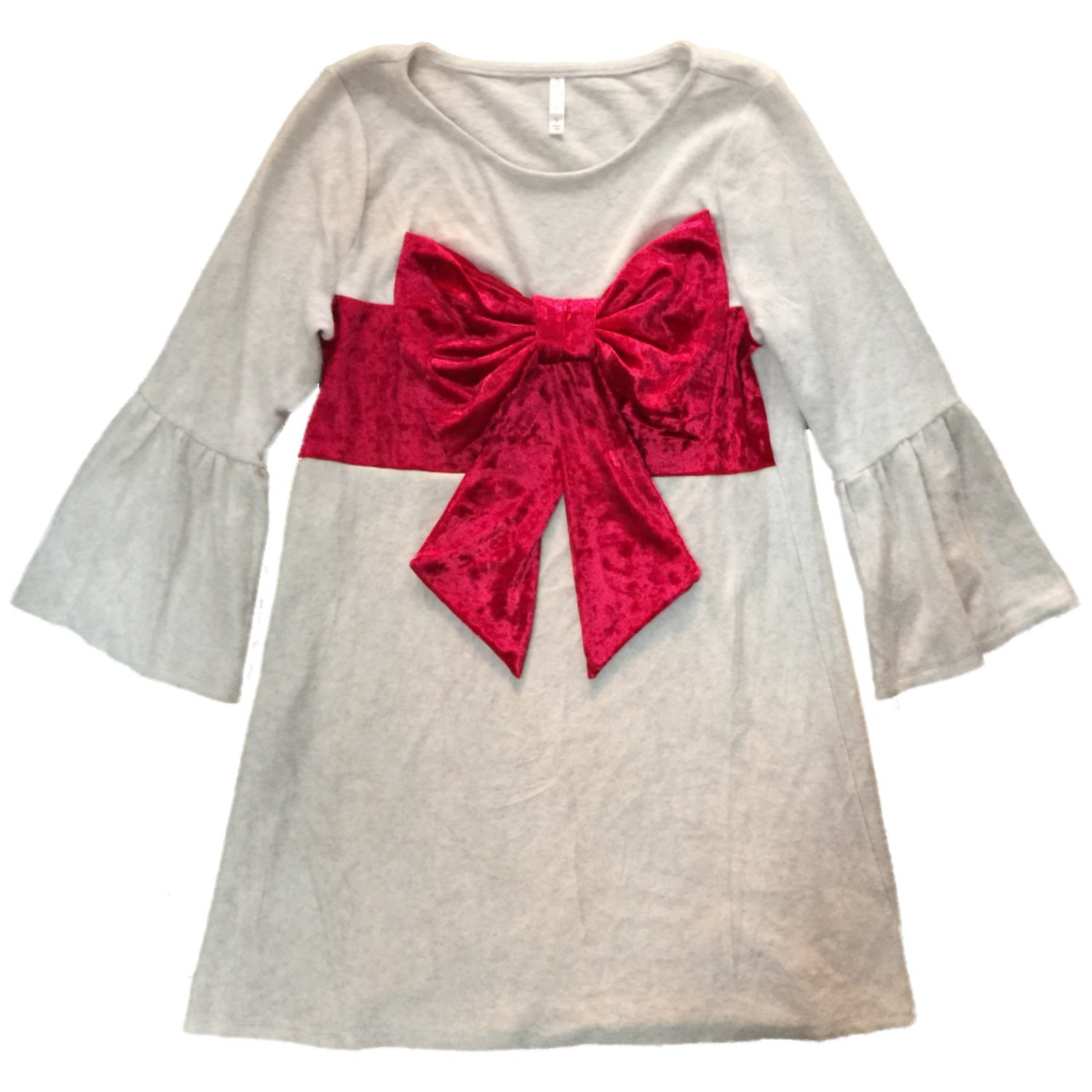 This pretty cream colored rayon blend holiday dress is topped off with a giant red velvet bow for an added wow factor!