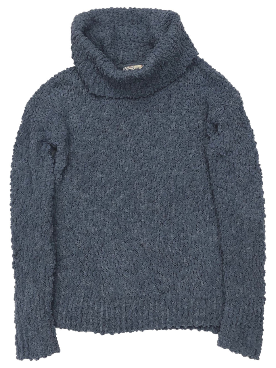 You will love wearing this pretty lumpy blue slit side cowl neck sweater on those chilly winter days!