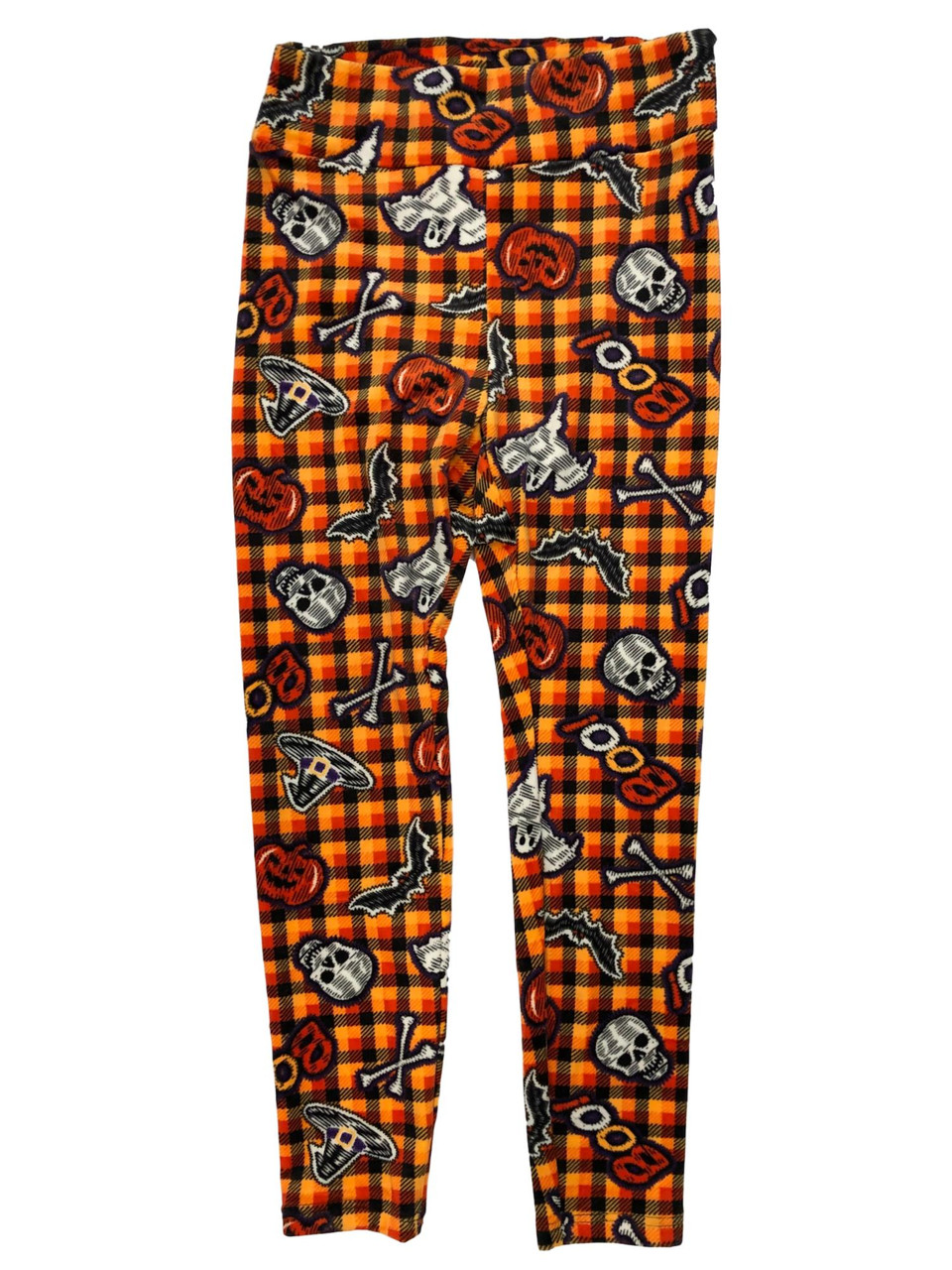 You will be ready for Halloween in these cozy plush high rise skull, bat, pumpkin, & ghost themed leggings!