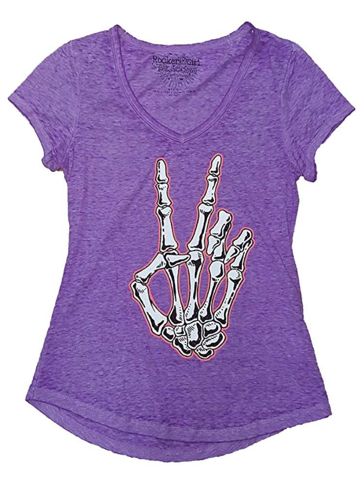 This fun semi-sheer purple 'Bony Fingers" skeleton themed t-shirt is sure to be a Halloween favorite!