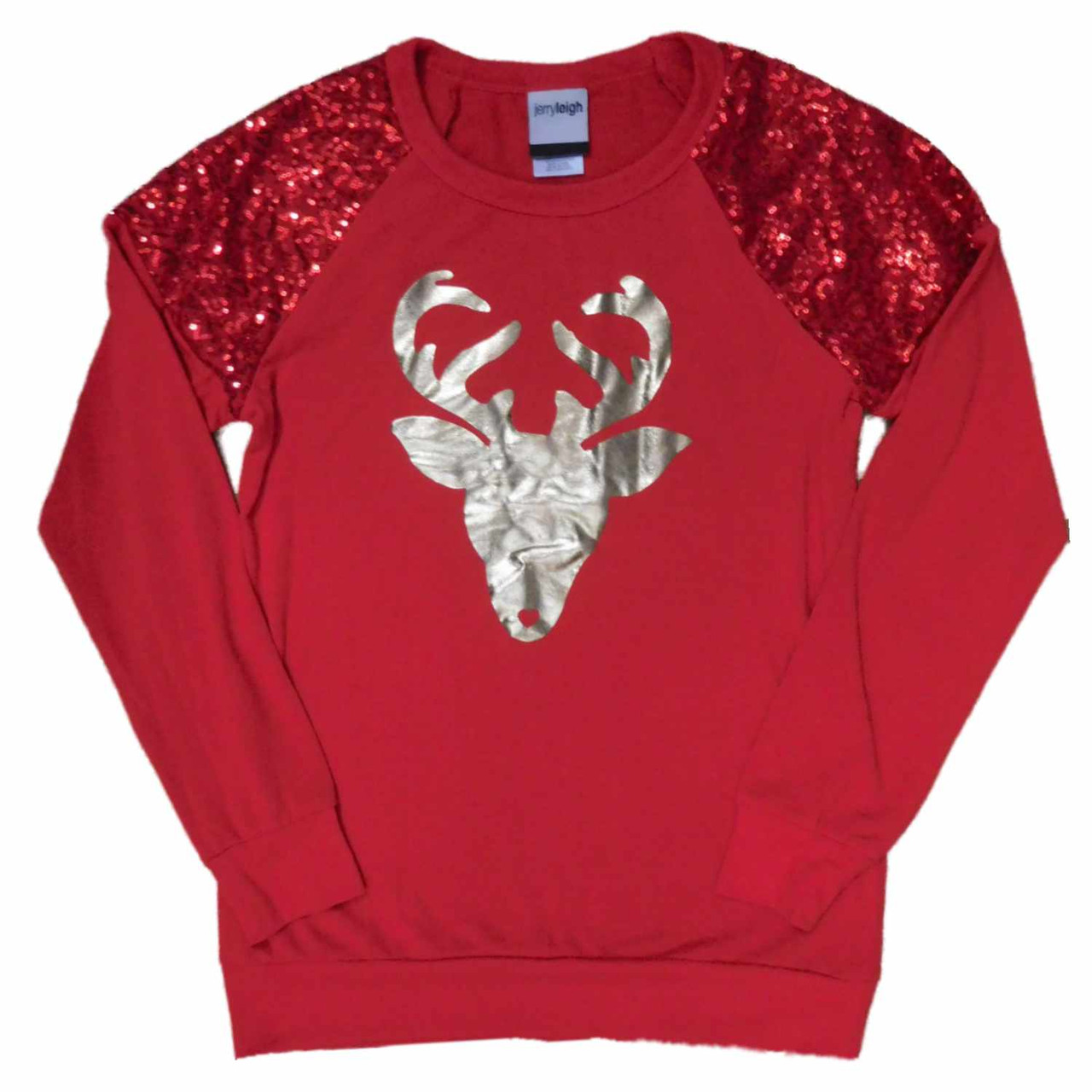 - Junior Womens Red & Gold Sequin Reindeer Shirt Lightweight Sweatshirt