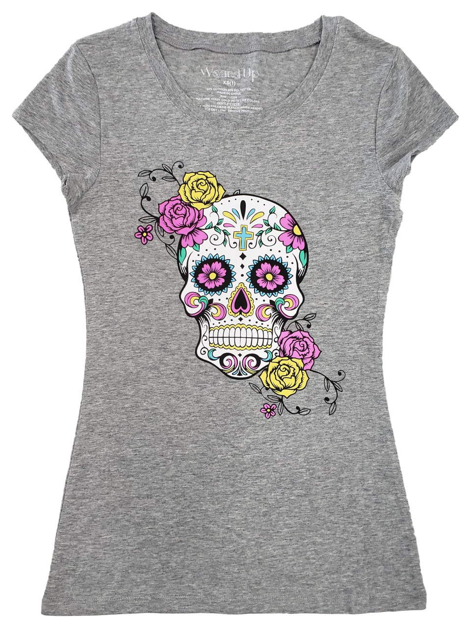 - Junior Womens Regular & Plus Size Grey Floral Skull T-Shirt Tee Top