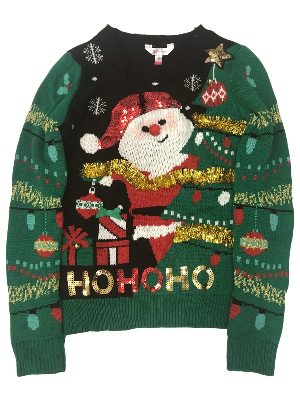 - Juniors Womens Green Tinsel Santa Claus Hoho Christmas Holiday Sweater