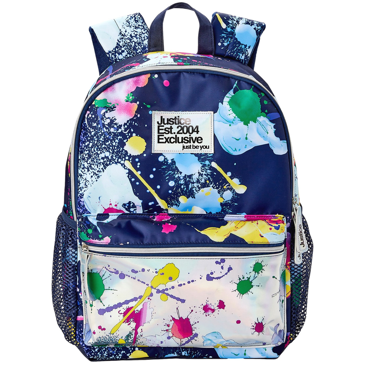 This Justice 17" multi-purpose backpack fits 2 to 3 books. It has a colorful splatter pattern on a blue background. It is features a large main compartment, padded laptop pocket, front pocket and 2 exterior side pockets. This darling backpack is just what you need for going back to school or day trips
