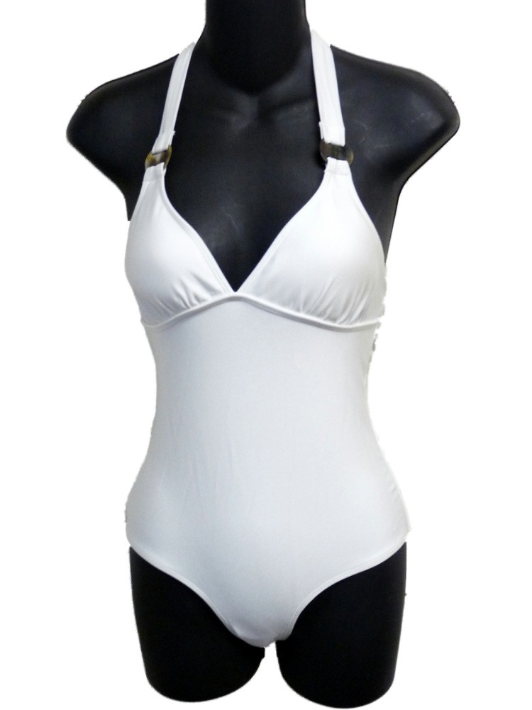 This attractive one piece halter style white swimsuit ties at the neckline with a decorative buckle on the strap and has a scooped back.