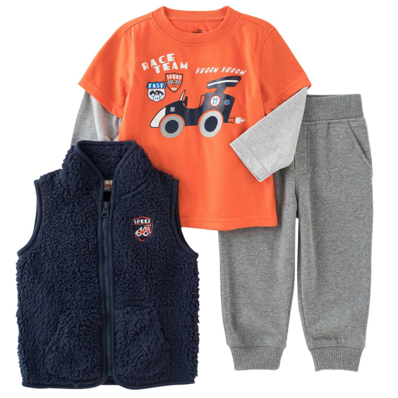 Dress your little one up in this stylish 3-piece outfit from Kids Headquarters! Includes gray sweat pants, an orange long sleeve shirt with Race Car designs & a blue zip-front plush vest.