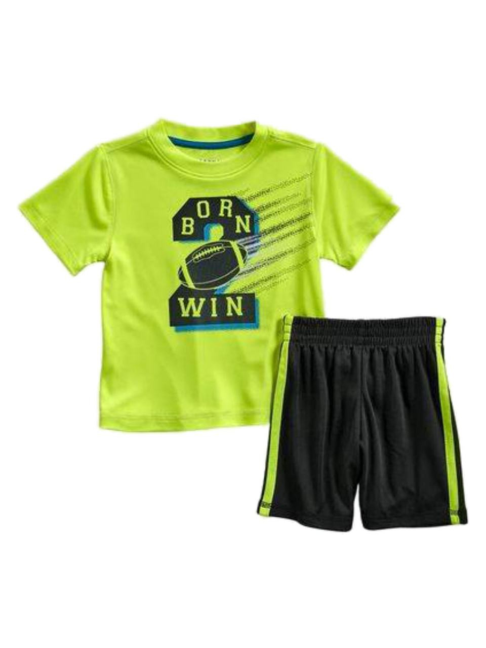 Your baby boy will look adorable in this football themed "Born (2) Win!" 2 piece neon yellow and black shirt and shorts athletic set!