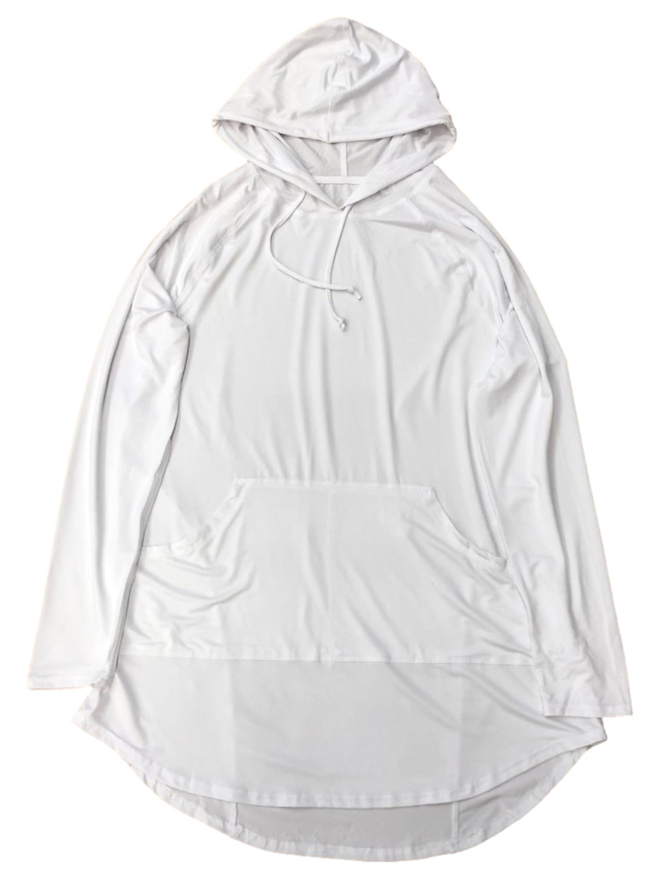 You will be ready to lounge by the pool or go to the beach in this pretty white hooded long sleeved swim suit cover up with kangaroo pocket!