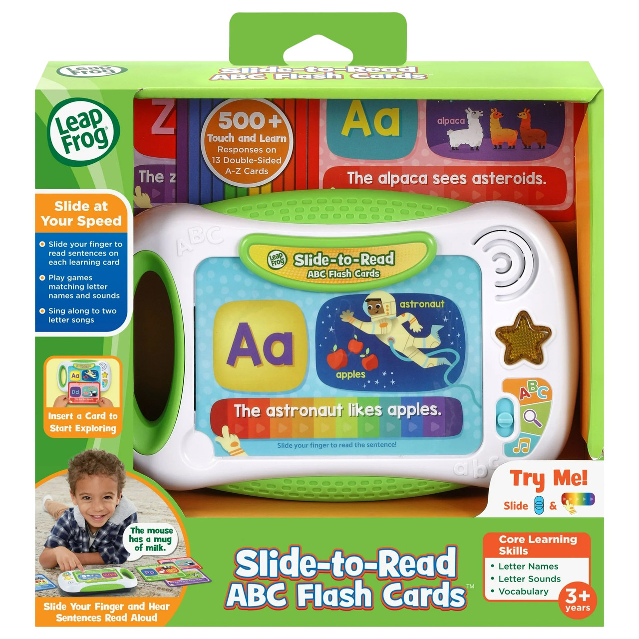 Experience LeapFrog Slide to Read ABC flash cards, interactive learning system. From A-Z, the 13 double-sided cards feature letters, words, sentences and colorful pictures. Learning our ABCs is as easy as counting 1, 2, 3. Preschoolers can touch the card to explore a letter sound, words that begin with that letter and a silly animal sentence. The mouse makes milkshakes! Slide your finger across the sentences from left to right, fast or slow, to follow along while hearing it read aloud. Let’s search! Hunt for the pictures or words on the card that the tablet asks for and touch the words and pictures to find them. Add music to the mix and touch the A-Z flash cards to add a variety of sound effects to five different melodies. Sing along to two letter songs by pressing the light-up star button. Slide the cards in the back to securely store them, then grab the handle to take it on the go. Intended for ages 3+ years. Requires 3 AAA batteries. Included batteries for demo purposes only. New batteries needed for regular use