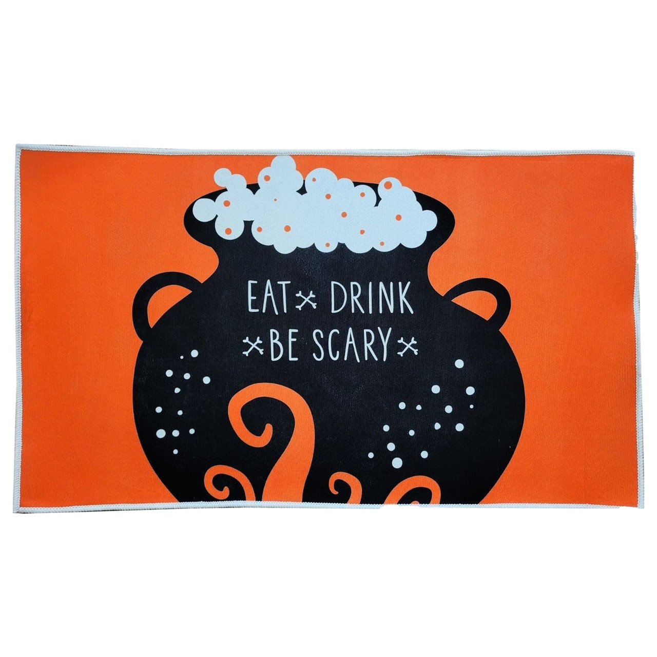 - Pattern of a bubbling pot on a orange background with "Eat, Drink, Be Scary" sentiments