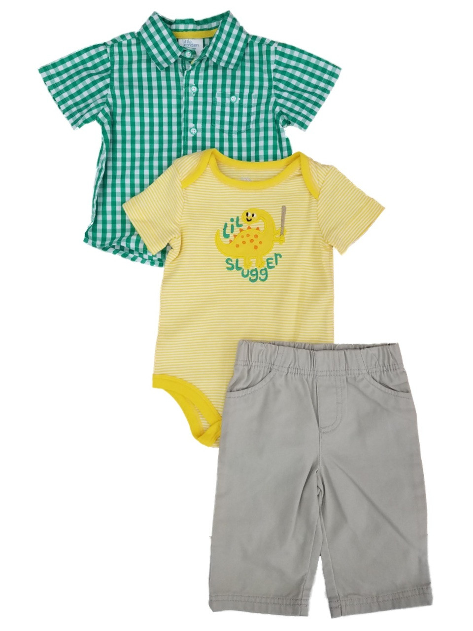- Infant Boys 3P Baby Outfit Shirt Pants & Lil Slugger Dinosaur Bodysuit 3-6m