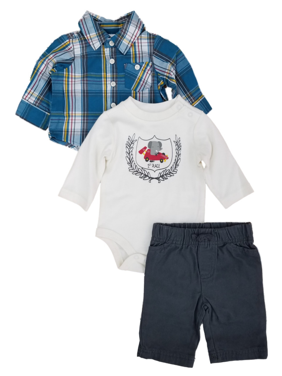 This darling 3 piece baby outfit from Little Wonders includes a creeper with an elephant graphic and says "1st Place", a plaid shirt, and gray pants.
