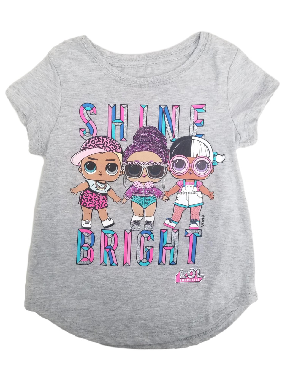 She will love wearing this cute gray sparkle short sleeved LOL Surprise "Shine Bright" t-shirt!