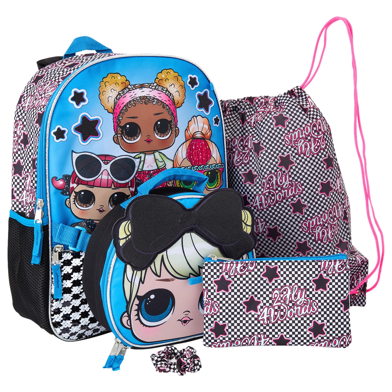 - 5 piece set includes backpack, insulated lunch bag, zip case, cinch bag and LOL hair scrunchie