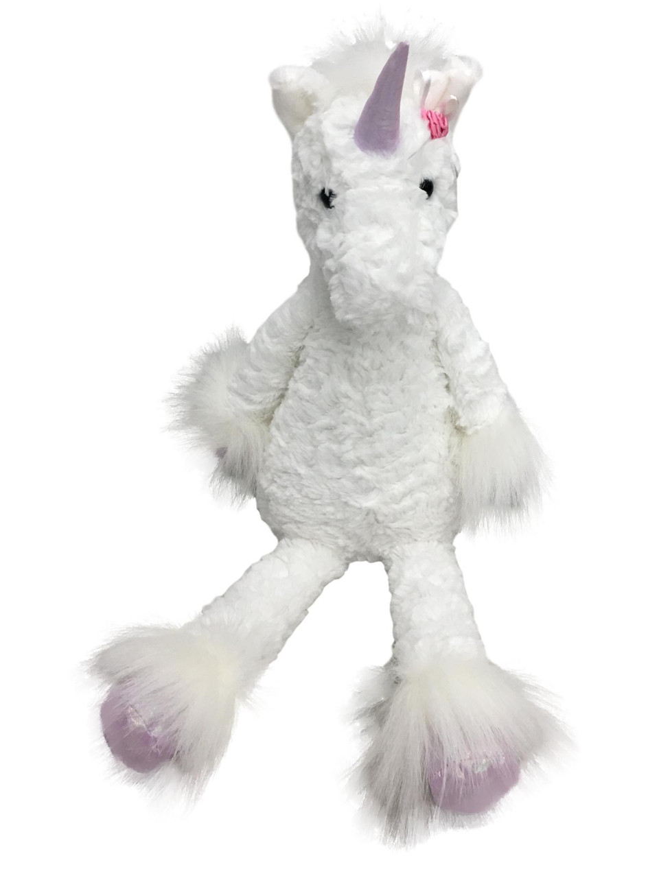 This gorgeous white unicorn features ultra soft rosette fur with shaggy fur mane, tail and accents. It will make a great stuffed animal pal