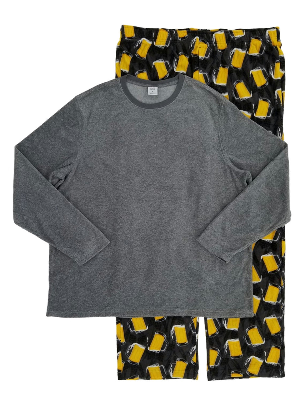This soft & warm fleece sleep set includes a long sleeve top and dark gray sleep pants patterned all over with beer mugs designs.