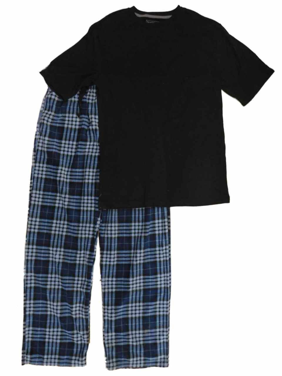 This pajama set includes a black short sleeve t-shirt and blue plaid fleece pajama bottoms with an elastic waistband, drawstring, side pockets and an open fly.