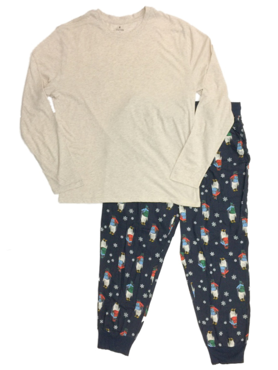 This cozy men's penguin themed pajama set includes flannel sleep pants & a long sleeved t-shirt.