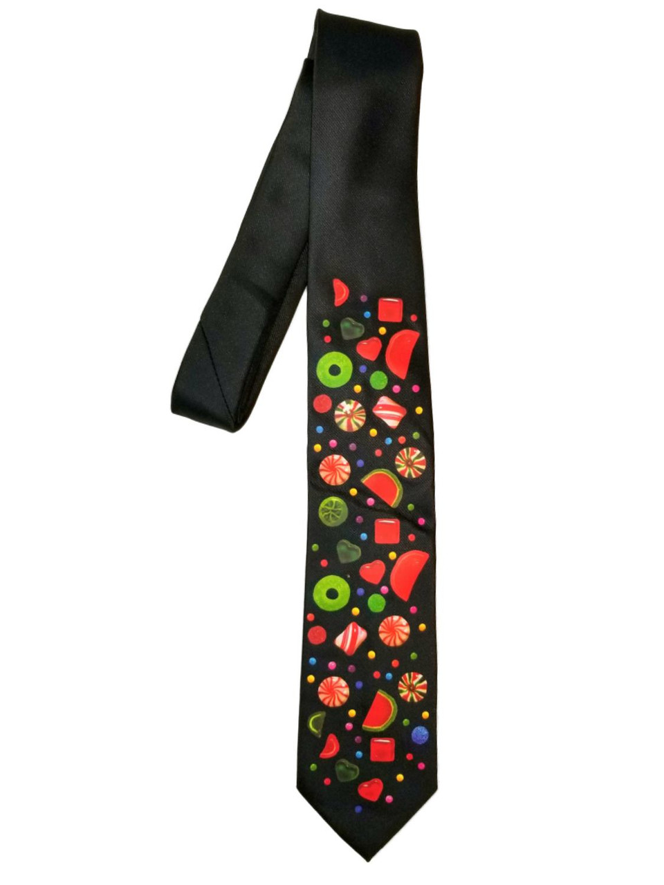 This fun black holiday necktie features Christmas candy running the length of the tie. It is sure to be a crowd favorite.>