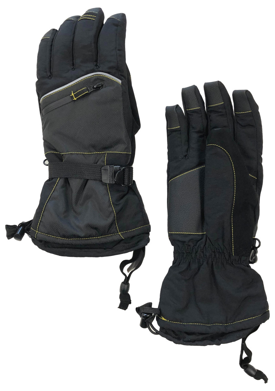 You will stay toasty warm in these Thinsulate insulated black & yellow waterproof, windproof, & breathable snow & ski gloves. They have adjustable gathered wrists & a zippered pocket for your lift ticket, credit card, or hand warmers!