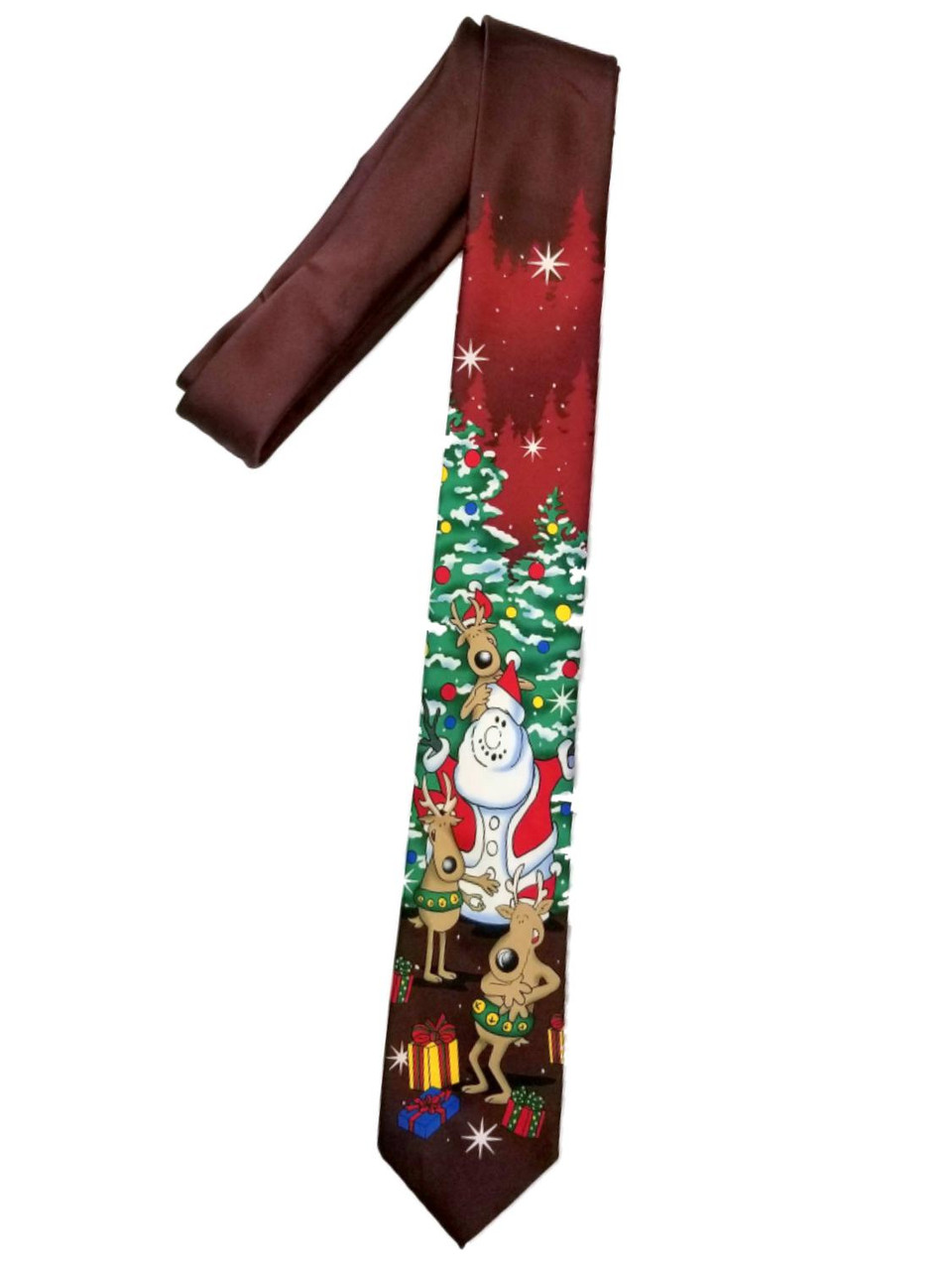 This brown holiday necktie features a snowman in a Santa costume with reindeer and presents. It is sure to be a Christmas crowd favorite.>