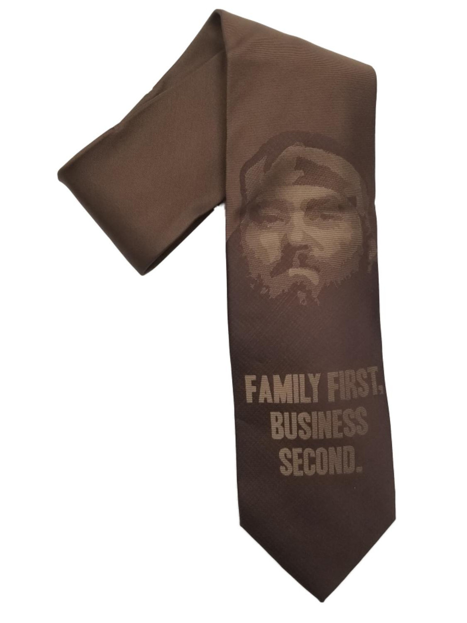 This Men's Brown neck tie, features Duck Dynasty's Willie Robertson and his "Family first, business second" quote. It is sure to be a favorite for your Duck Dynasty fan. >