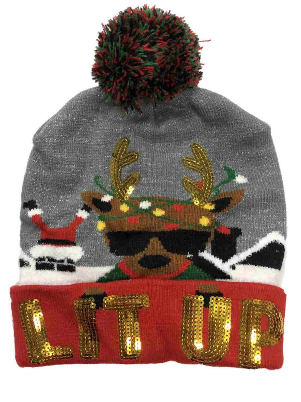 - Mens Gray & Red Sequin Lit Up Reindeer & Santa Christmas Holiday Beanie Hat