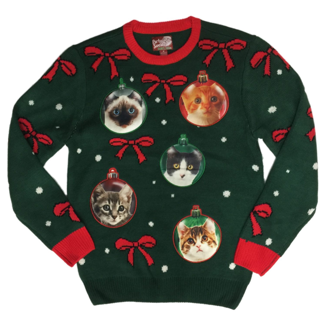 - Mens Green/Red Christmas Cats Kitten Ornaments Holiday Party Sweater