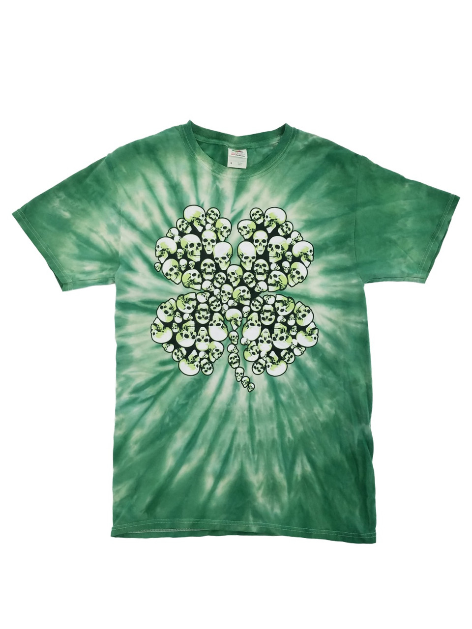 This tie dyed t-shirt features a graphic design of a four leaf clover made from a pile of skulls.