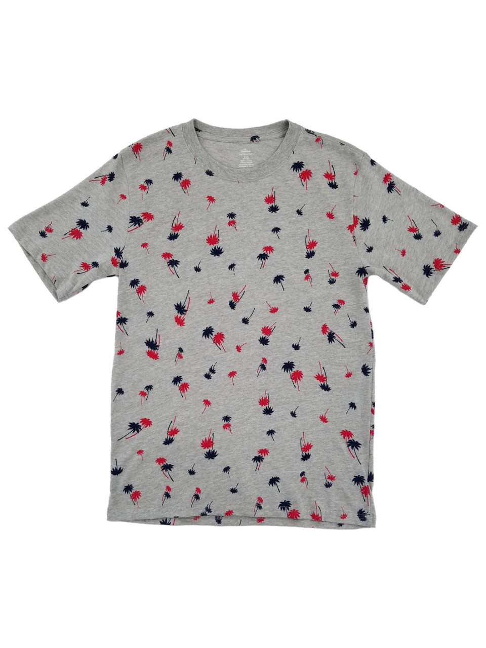 This patriotic t-shirt is patterned all over with red and blue palm tree designs.