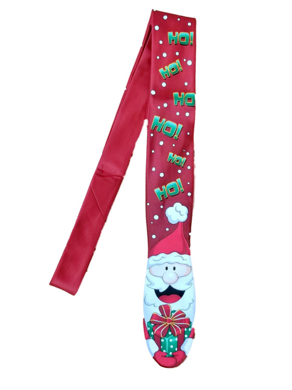 This fun red holiday neck tie features Santa holding a Christmas present and has the words "Ho Ho Ho" running the length of the tie. It is sure to be a crowd favorite!>