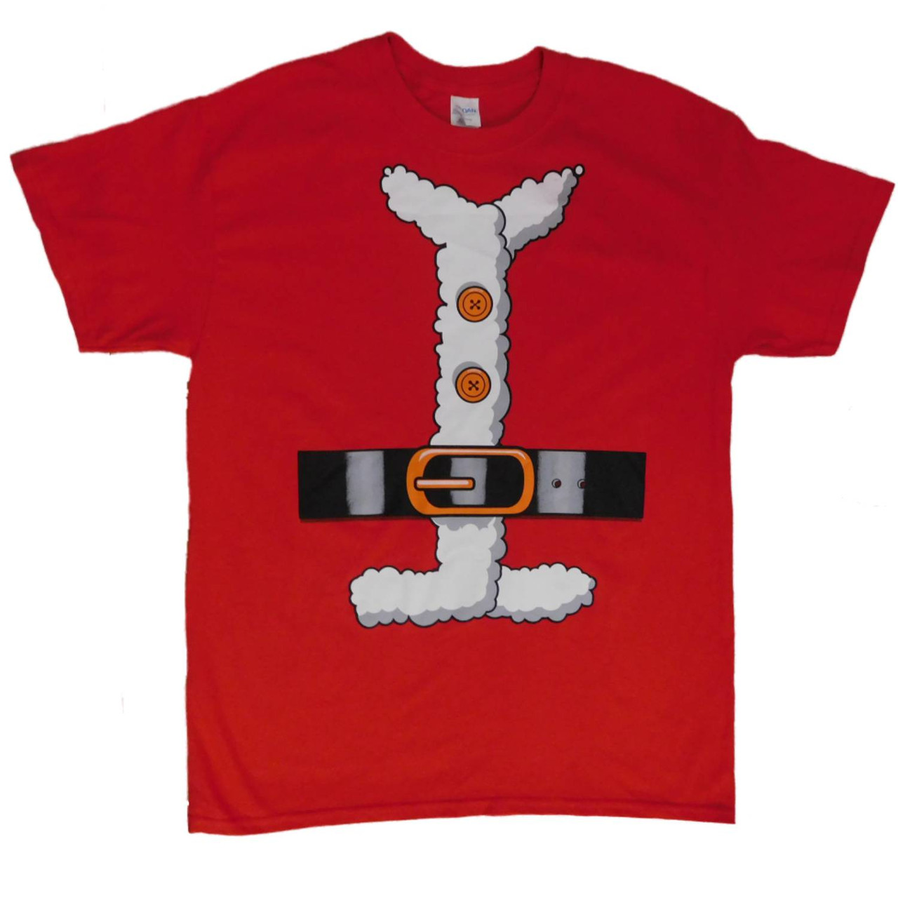 This fun Christmas shirt features a Santa Claus outfit design on front. Perfect for holiday parties!