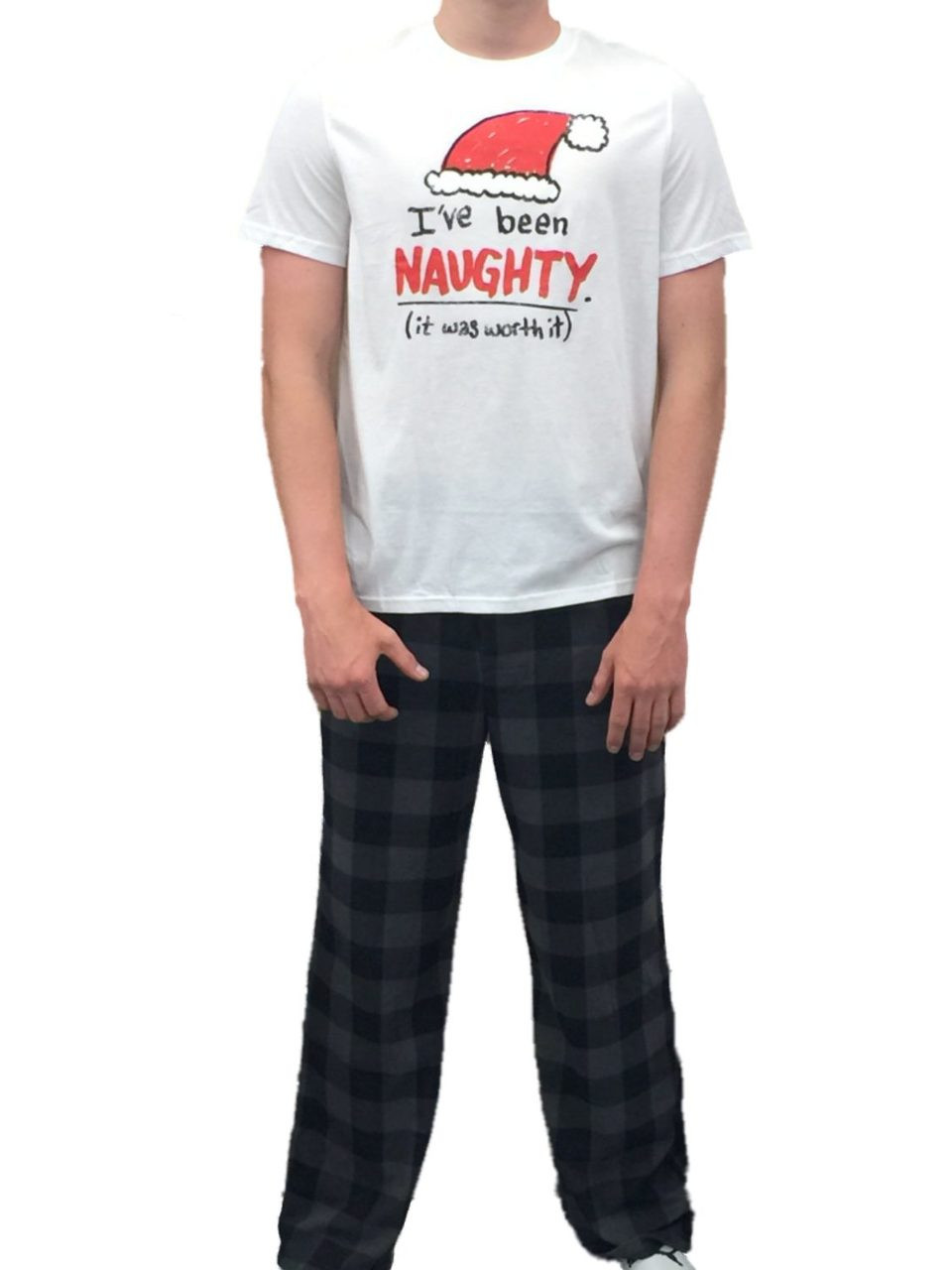 This cozy men's "I've been naughty, but it was worth it" holiday sleep set includes fleece sleep pants and a short sleeved t-shirt.