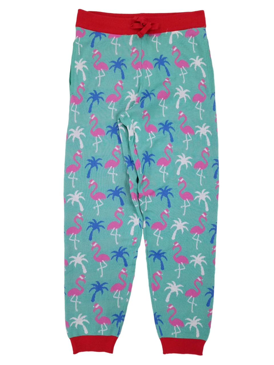 These soft knit joggers are perfect for the holiday season! They are patterned all over with pink flamingo's wearing Santa hats and palm tree's.