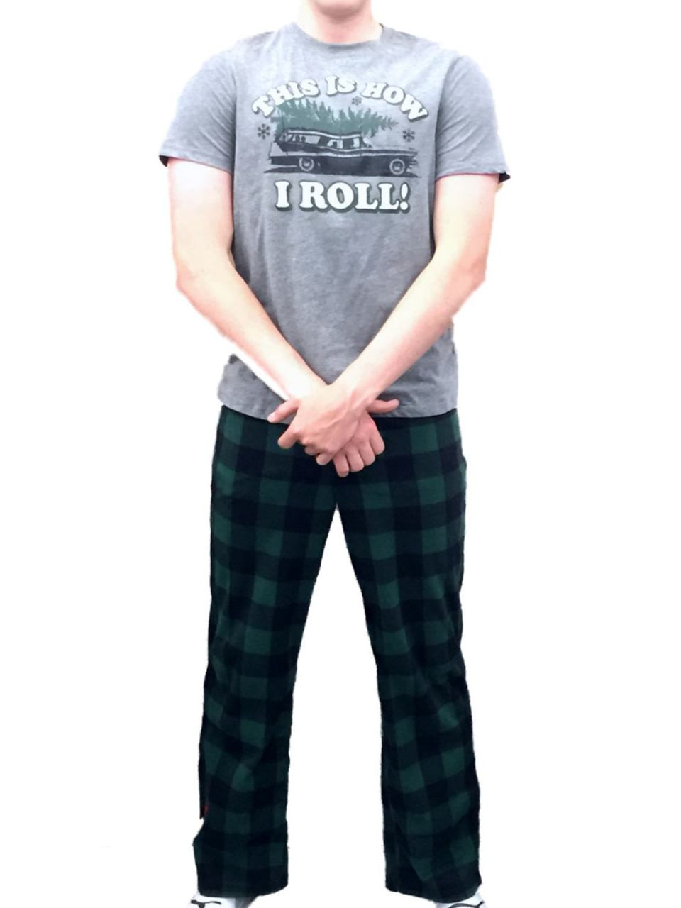 This cozy men's "This is how I roll" Christmas sleep set includes fleece sleep pants and a short sleeved t-shirt.