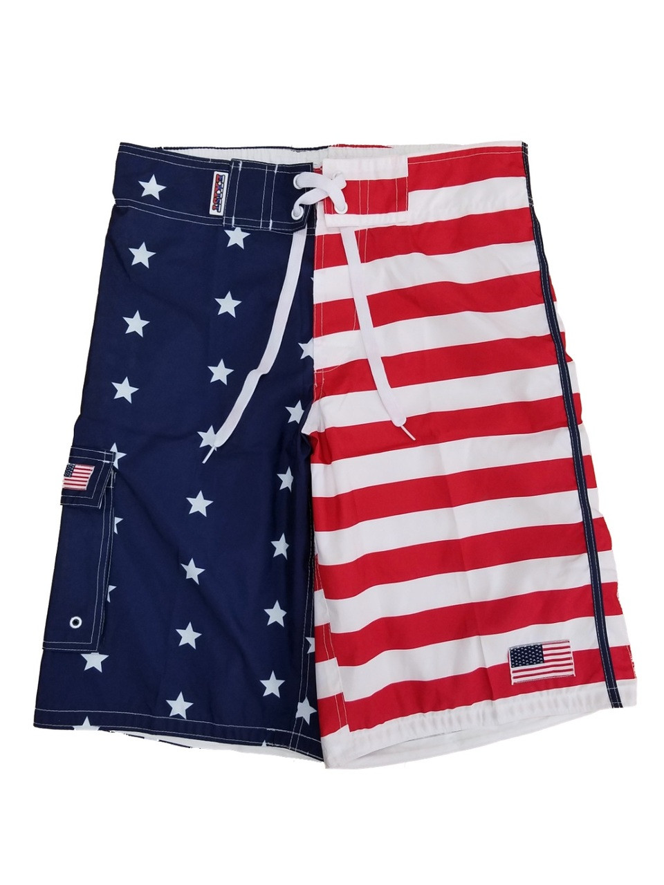 These US Flag themed cargo board shorts are perfect for showing off your national pride! They have a lace tie waist with fly, an elastic back waistband and a full mesh lining.