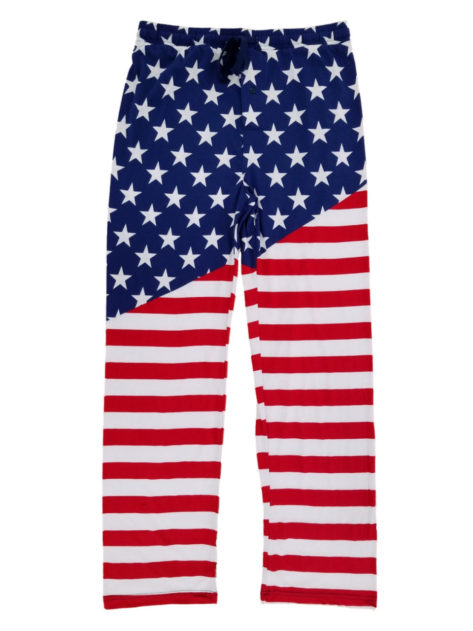 These patriotic sleep pants are perfect for lounging around in! They are made of a soft and cozy knit fabric and have an elastic waistband with drawstring and a buttoned fly.