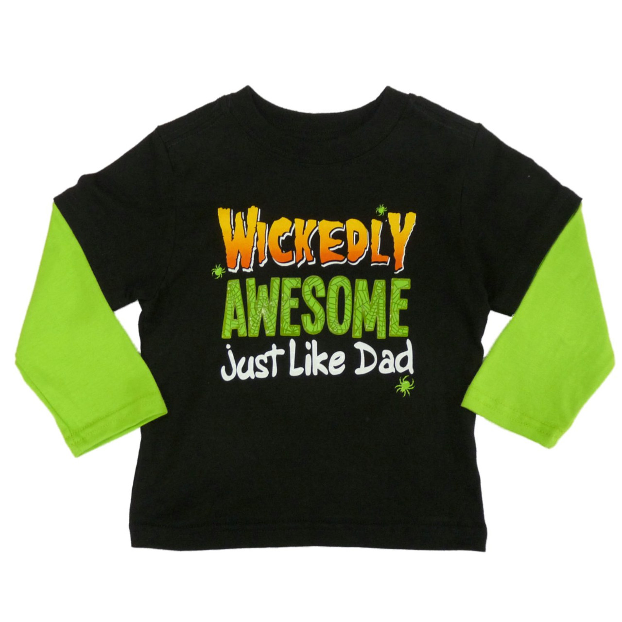 This spooky and fun Halloween shirt has mock layered sleeves and features a 'Wickedly Awesome Just Like Dad' design.