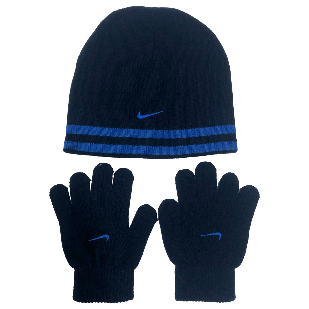 - Nike Boys Blue Knit Beanie Hat & Gloves Cold Weather Set