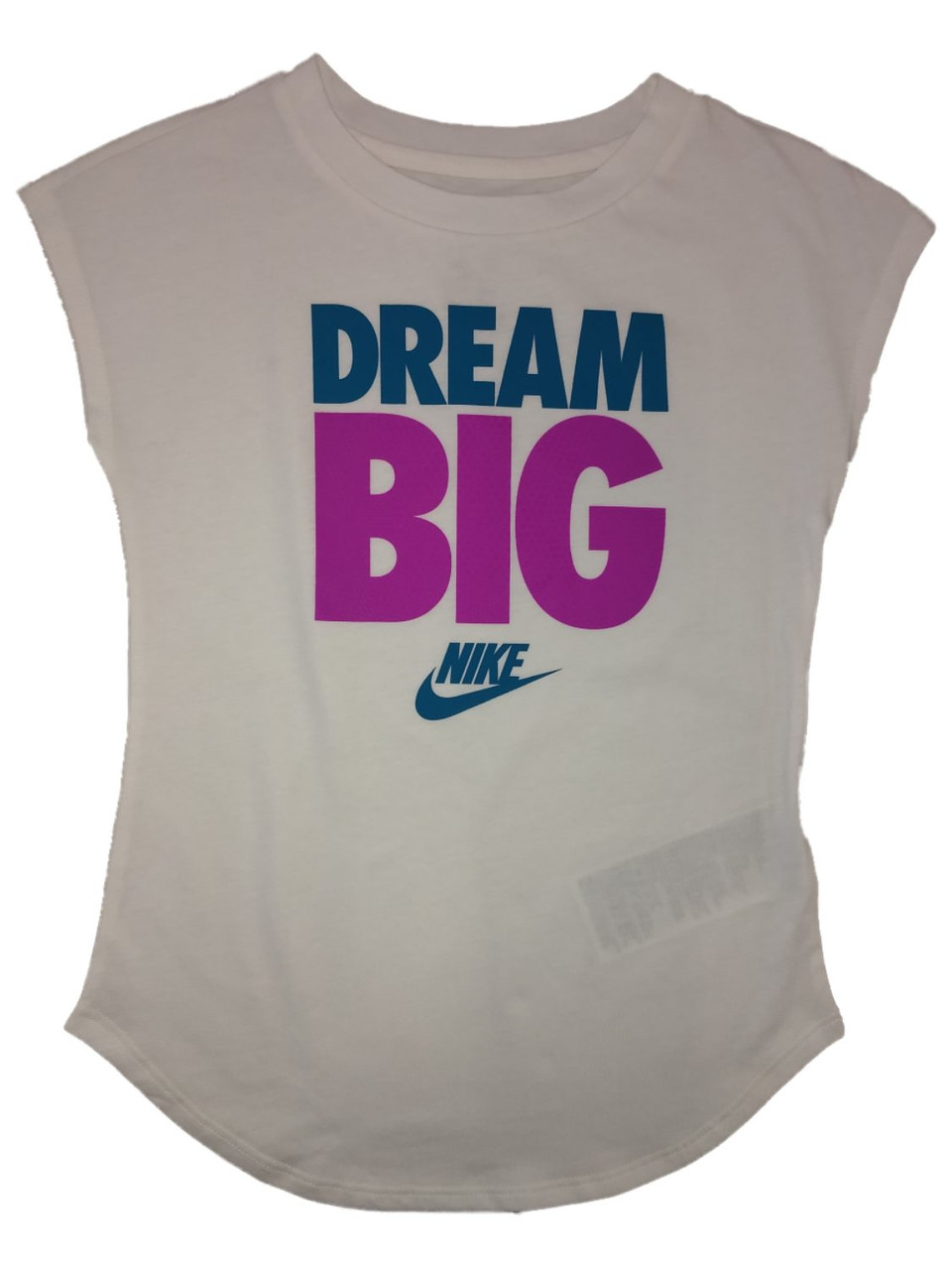 This fun girl's white "Dream big" Nike athletic t-shirt is sure to be a favorite!