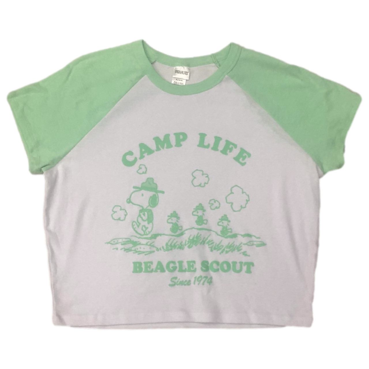 This cute white & green Snoopy themed "Camp Life" semi-cropped tee shirt will add a touch of whimsy to your outfit!