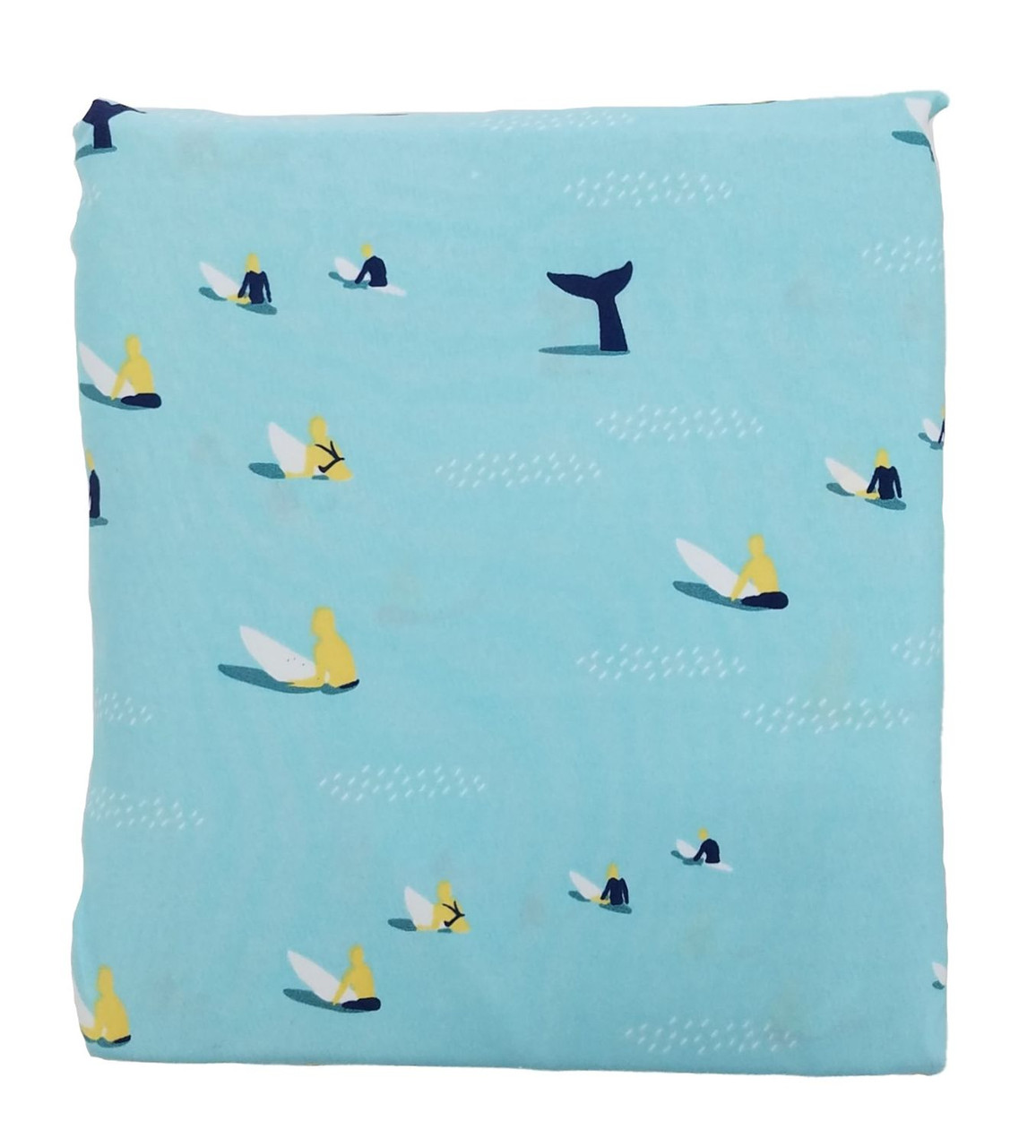These Pillowfort sheets feature a pattern of whale watching surfers on a blue background. They fit mattresses up to 16 inches deep and are perfect for any bedroom