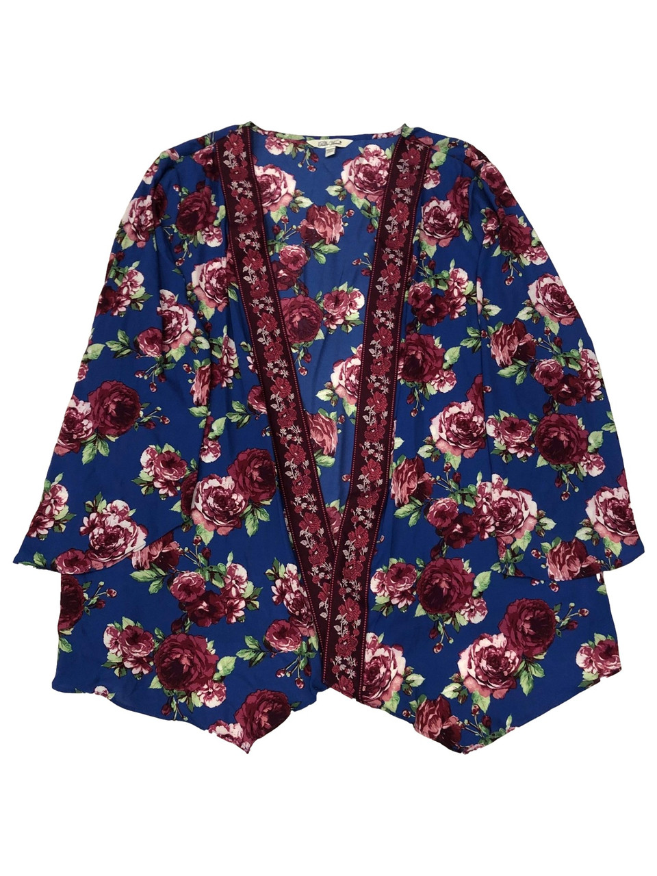 You will get lots of compliments in the gorgeous lightweight silky blue & pink floral rose print blousy cardigan style open front over-shirt! It will look great with your favorite pair of jeans or slacks!