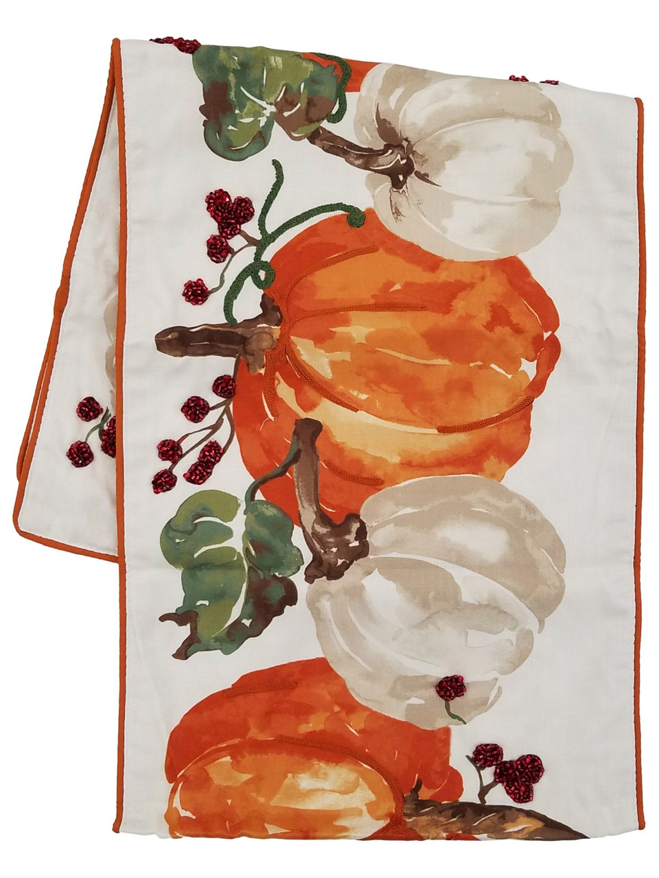 - Autumn pattern of orange and white pumpkins on a leafy vine with beaded red berry accents and red trim at the edges