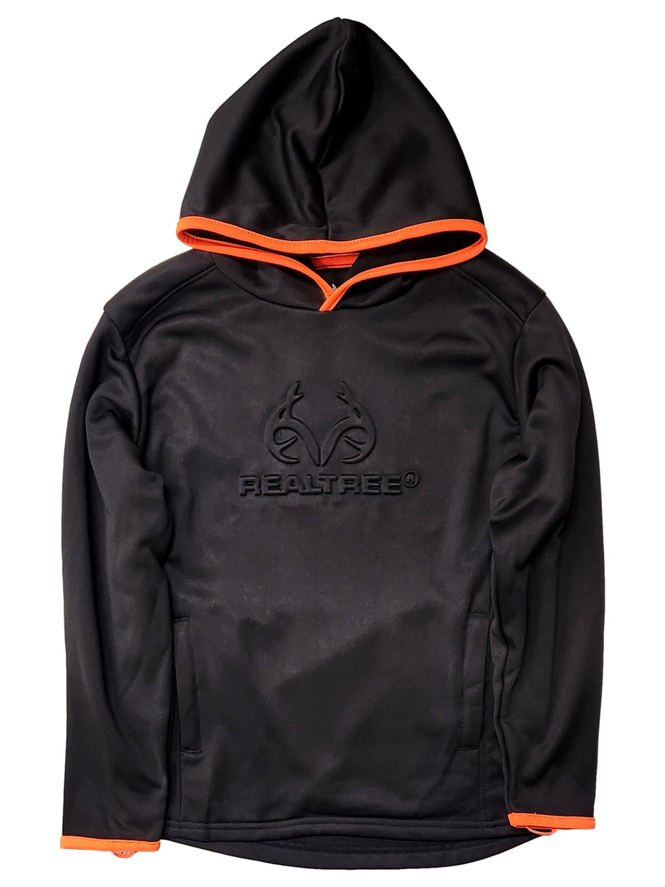 He will love wearing this cool black Realtree hoodie with orange trim and 2 side pockets!