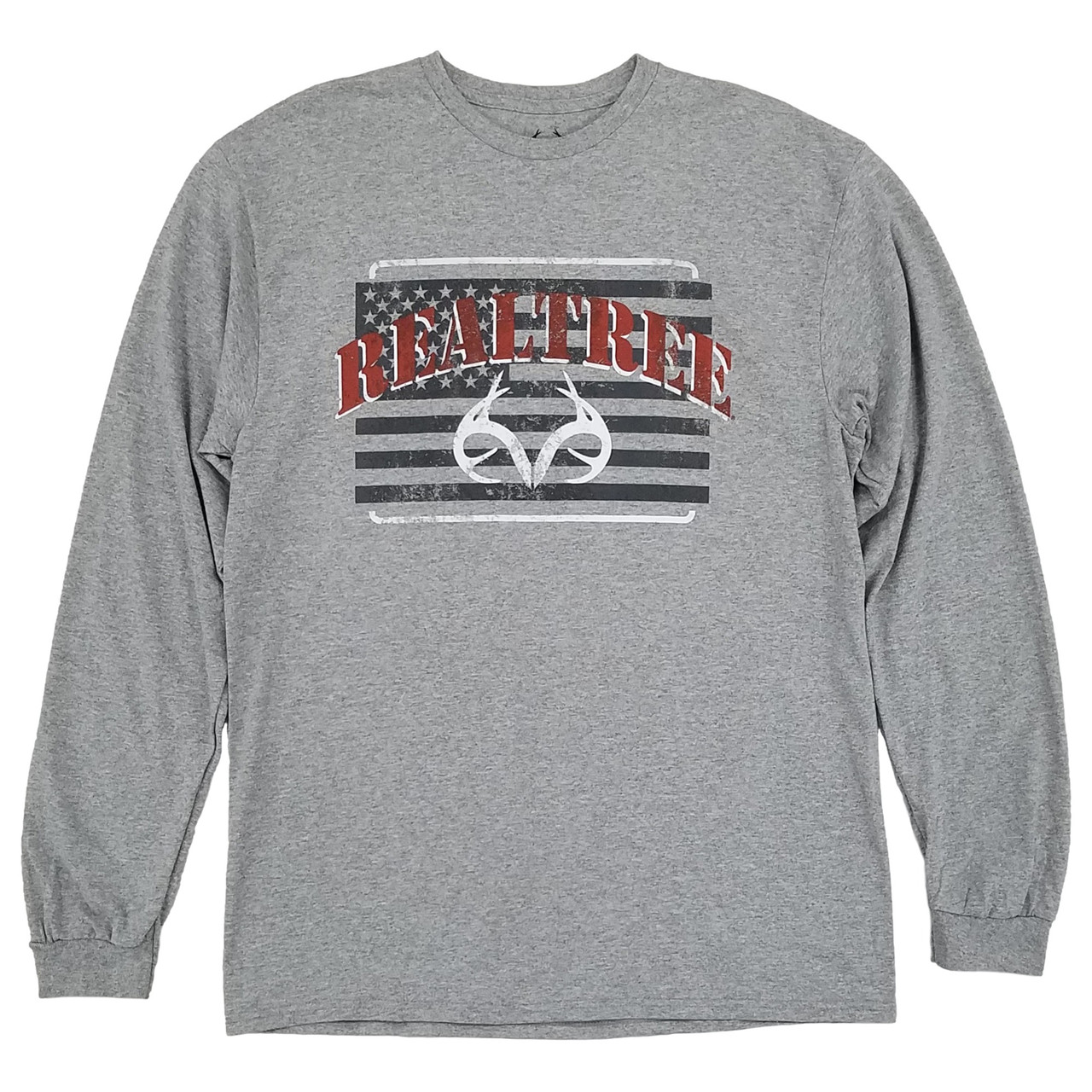 - Realtree Mens Gray Heather Long Sleeve US Flag Graphic Hunting T-Shirt