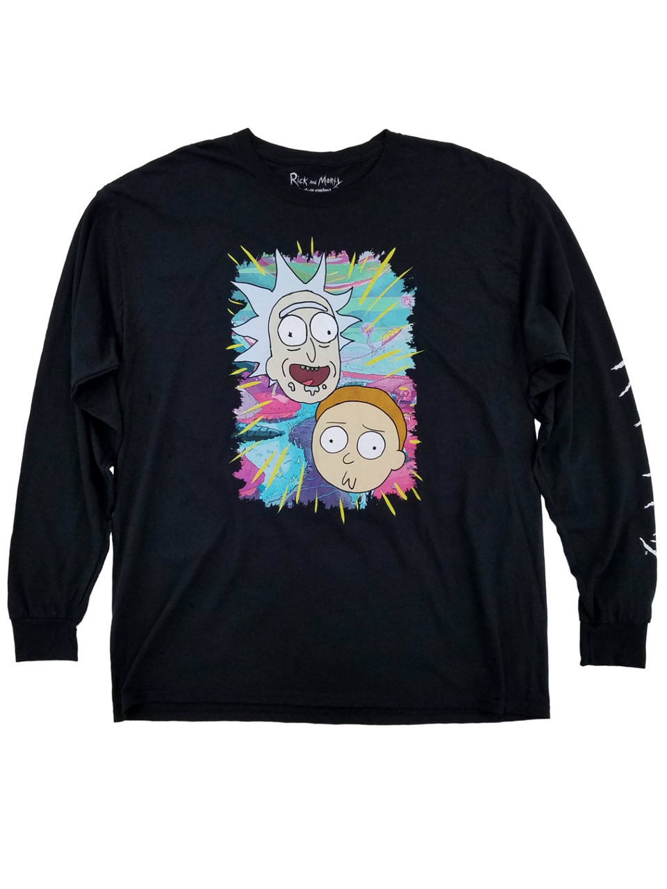 This long sleeve shirt features a large graphic design on front and says "Rick and Morty" on the sleeve.
