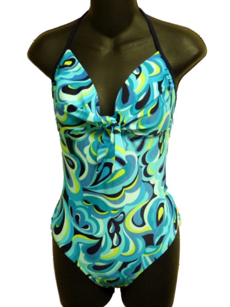 This gorgeous blue swimming suit has a fun psychedelic print, a full lining, and a pretty knotted bow to accentuate your cleavage. It is perfect for the beach or the pool!